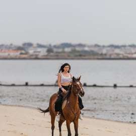 Senti la brezza del fiume Tago su questa spiaggia tranquilla di sabbia bianca piena di conchiglie. In un tour PRIVATO, prova l'emozione di galoppare lungo la riva, abbracciando la libertà più pura!