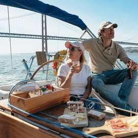 Lasciati incantare da Lisbona, vista dal mare! Immagina: una rilassante crociera in barca a vela, il dolce ondeggiare delle acque del Tago, e davanti a te, uno spettacolo di bellezza senza pari. Castel San Giorgio, Belém e altri monumenti iconici si susseguono, mentre tu sorseggi un drink fresco e gusti deliziosi snack.