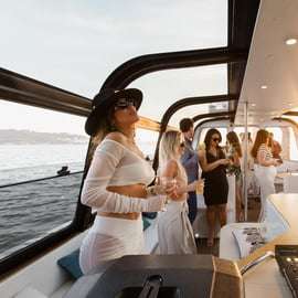 Non preoccuparti se il tempo sembra poco amichevole: la nostra barca può essere completamente chiusa in vetro, garantendo un comfort totale e una festa indimenticabile, indipendentemente dalle previsioni.