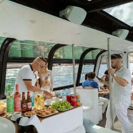 Non preoccuparti se il tempo non è dei migliori: la nostra barca può essere completamente chiusa con vetri, garantendo il massimo comfort in modo che la festa continui, con la pioggia o con il sole.