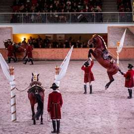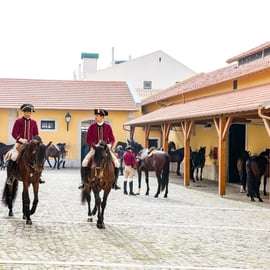 Inizia la tua visita con un'occhiata dietro le quinte a come gli addestratori e i cavalli si preparano per gli spettacoli di danza. Assisti agli esercizi di riscaldamento e agilità eseguiti da cavalieri vestiti con autentici costumi d'epoca, che assicurano la salute e l'allenamento di ogni cavallo lusitano per galà e spettacoli di alto livello.